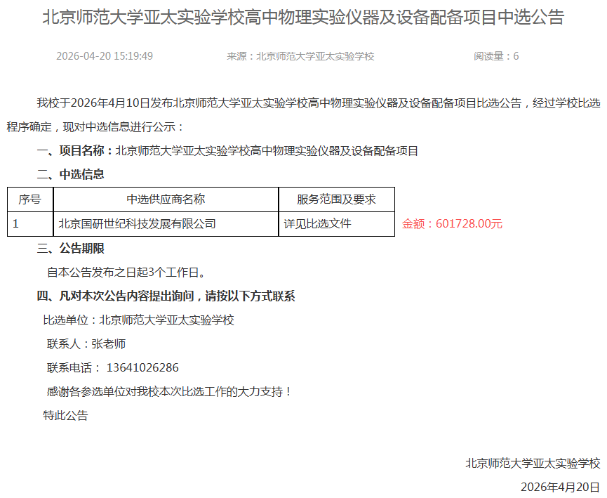 北京师范大学亚太实验学校仪器及设备配备项目中选公告